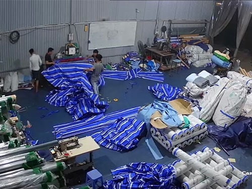 Xưởng sản xuất với diện tích lên đến 500m2. 10 nhân công cùng các trang thiết bị máy móc hiện đại luôn sẵn sàng gia công cắt may, ép bạt, chuẩn bị hàng hóa, linh kiện phục vụ cho đội thợ thi công.